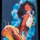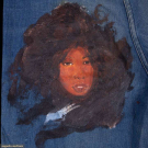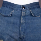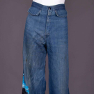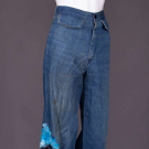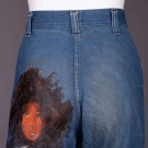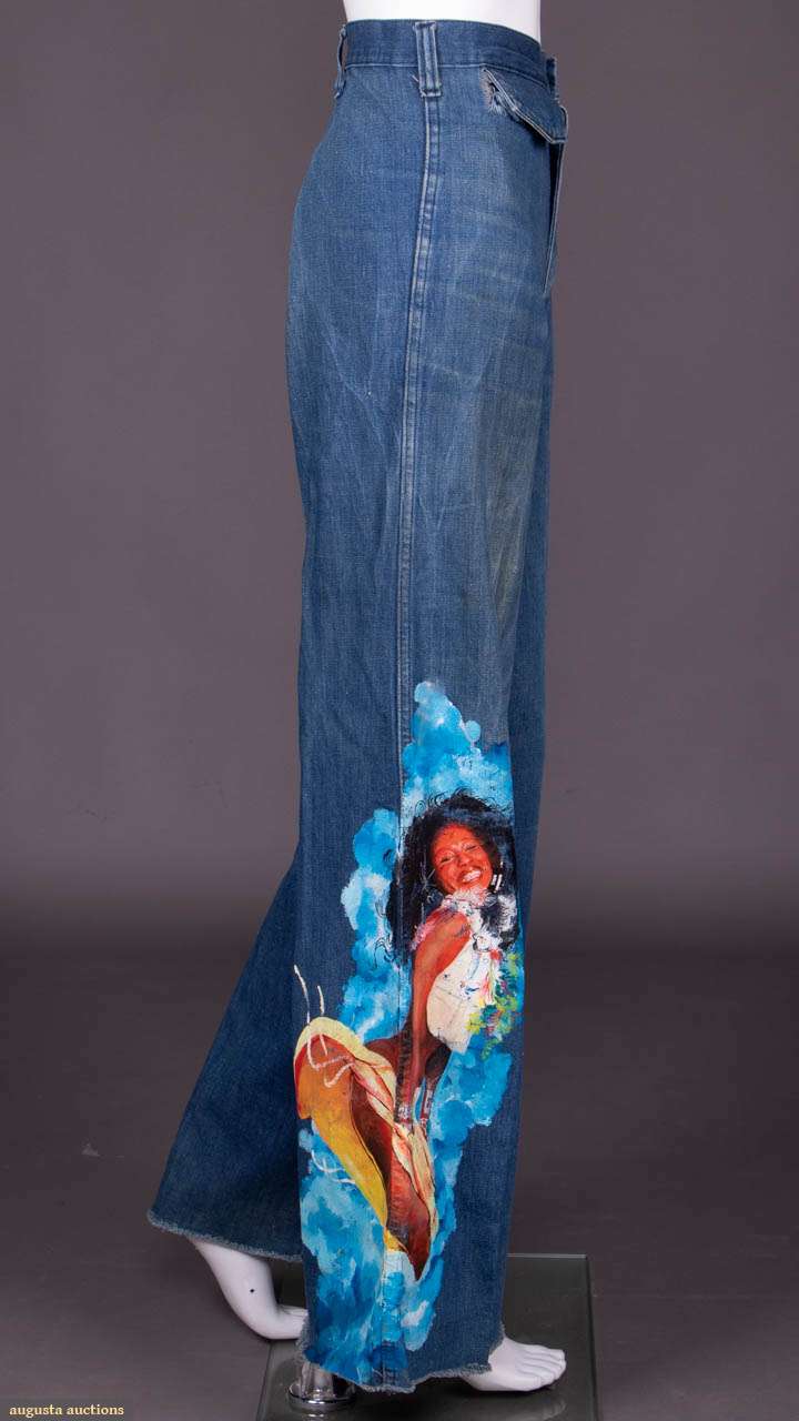 Hand painted high waisted denim trousers w/ horizontal flap pockets at front W, zip & snap closure at CF, handpainted portrait of exotic dancer, at lower right leg & back left seat, W 31", L 44.5", inseam 33", (paint chipping to button, stains to lap, pocket linings damaged & w/sm tears at corners, paintings worn & cracking, 0.25" hole right lap) good.