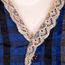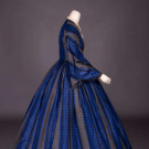 Silk taffeta day dress w/ blue, grey & black vertical stripe & horizontal shadow stripe, pagoda sleeve, CF brass button closure w/ riveted blue glass cylindrical bead, watch pocket at left W, full complex box pleated skirt lined in glazed cotton, L 54", (CF bodice modified w/ inserted lace panels, 5" stain surrounding 2" hole right lap, re-hemmed & shortened) good.