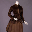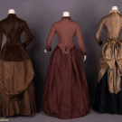 3-pc brown w/ velvet & satin stripe bodice, brown ribbed silk overskirt & skirt w/ double box pleated flounce, label "Trademark Goodyear's Impervious Shield Warranted Patent Nov. 1", B 35", W 26", L 26", skirt W 25.5", L 40", (lace shattering, sm pulls) excellent; 2-pc w/ brown, red & cream wool & cashmere bodice w/ Celtic cross buttons, taffeta Van Dyke trim at cuffs & collar, taffeta skirt, B 35", W 25.5", L 15.5-20", skirt W 22", L 41", (stains/shattering collar, tiny-0.5" holes, 1" hole, 2 missing hooks & eyes, skirt W modified, missing overskirt) good; 1 extended Polonaise bodice in brown & cream fine striped silk taffeta, B 33.5", W 25", L 45.5", (pin holes at CF, lace collar worn/stained) excellent.
