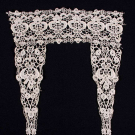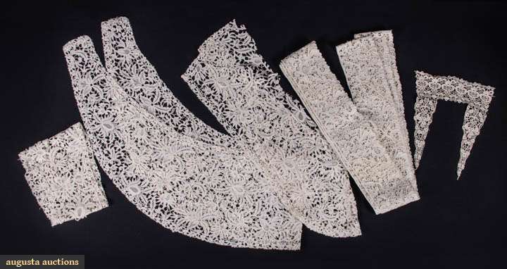 1 lace length of Italian needlelace yardage, L 9.5 yds, Wd 4.5", (light stains); 1 small square collar of Italian needle lace, inner circ. 22", outer 33", Wd 3", (broken brides); 1 chemical lace cuff, circ. 19"-21", Wd 6"-8", (broken brides, worn/stained thread knots at edge); 1 chemical lace large collar, inner circ. 40", outer 60", Wd 11", (inner edge raw, broken brides); 1 large circular flounce of chemical lace, inner circ. 62", outer 83", Wd 11", (broken brides, spot stains); t/w 4 lace pieces, all good-excellent.