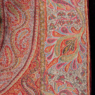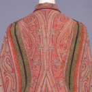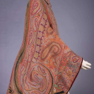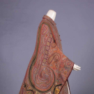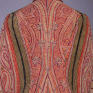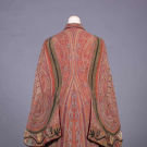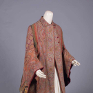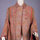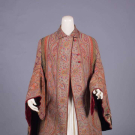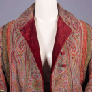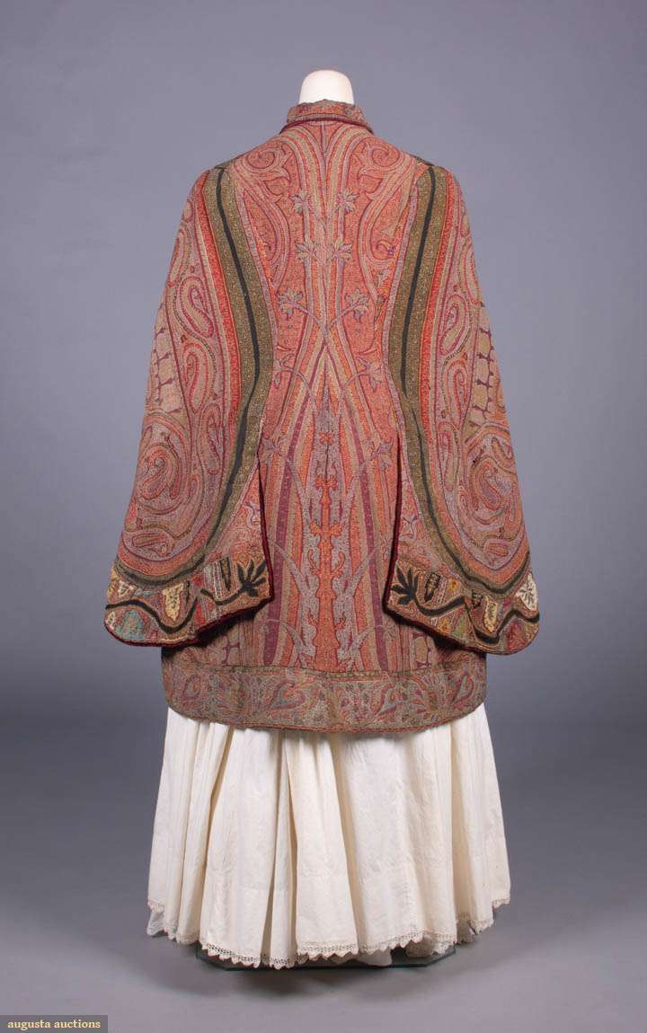 Wool paisley dolman brilliantly pieced from 1850s Kashmir shawl, embroidered gates manipulated to create sleeve edging, lined in burgundy silk velvet & quilted silk satin, B 37", W 45", L 35.5"-37", (light collar stains, fading, stains to velvet lining edges, second button missing, tiny-0.75" holes throughout, some quilting stitched undone) good. From the Collection of A.T. Jones & Sons.