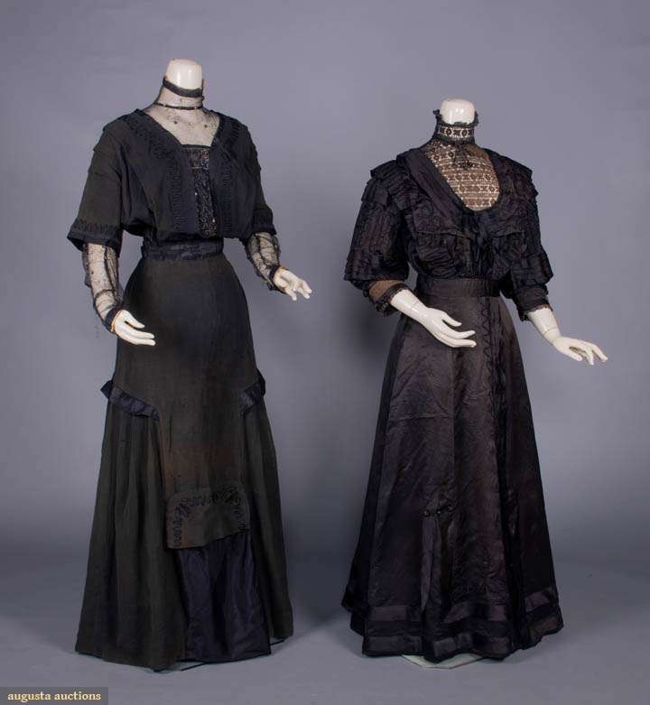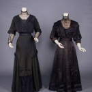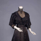 Both monobosom: 1 linen dress w/ lame & multicolor embroidered net stock collar, yoke, CF insert, & lower sleeves, Corelli machine applied silk cording, black silk W band & edgings, c. 1906, B 42", W 26", L 58", (1" tear W seam, boning in collar warped & broken, tiny-0.5" holes, broad light fading, wear to embroidery, modified at CF hem, 3" torn seam right underarm, shattering collar & cuff lining) fair; 1 black silk satin dress w/ soutache & machine knitted lace stock collar & bib insertion, & applied to cuff of 3/4 length sleeves, Turks head knot drops accents, c. 1910, B 35", W 25", L 52", (broad fading, few tiny holes/tears, few missing closures, cord trim worn, 1" repair CF) good. Sam Houston State University.