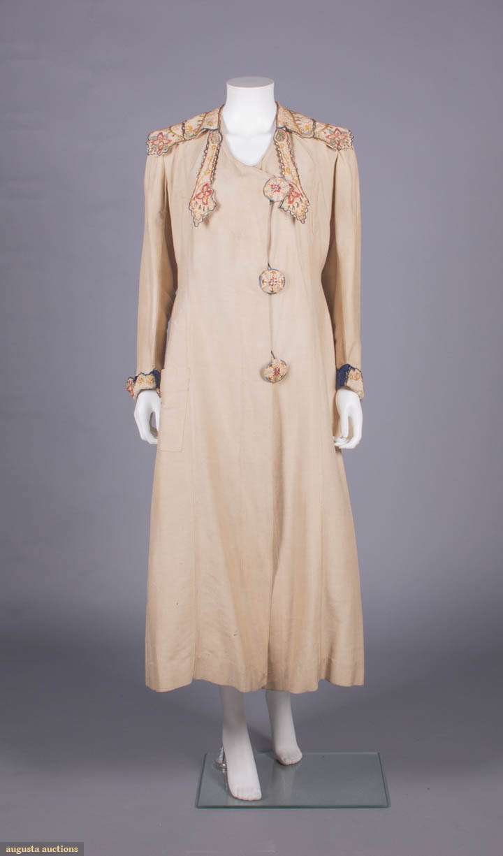 Cream silk pongee duster w/ silk velvet ribbon trim & pearl cotton hand embroidery & metallic bullion tassels to collar, elongated front tabs, decorative patch pocket buttons, cuffs & oversized CF button closures, label "J. Mandleberg Co. Limited, Manchester, London & Paris", B 40", W 34", L 50", (button loops worn, shattering to lining at neckline, 1.5" seam opening right collar & 1" at left, hem dirty, few scattered tiny-0.5" spot stains, 1" stain CB W, light discoloration cuffs) good. From the Collection of A.T. Jones & Sons.