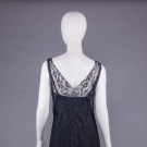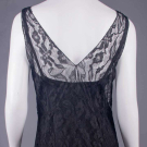 Black mm lace w/ red silk velvet & taffeta florals to CF at draped scoop neckline, shallow V neckline at CB w/ small keyhole, B panels gathered to slightly flared vertical CF panel for shaping over bodice & continuing into deep hem flounce for fullness in skirt, B 40", W 30", L 57", (minor fraying to faux flowers & edges, 1.5" hole back left hem, few broken brides) excellent.