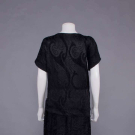 Heavy silk satin brocaded in arabesque motif in raised rib pattern & silk velvet linear motifs overlayed w/ iridescent glass bugle bead to accentuate underlying motifs, scoop neck, short sleeve, draped W sash gathered into fall at left H w/ long silk tasseled fringe, B 38", W 36", L 43.5", (minor bead loss, tiny-0.25" holes lap, fringe ends fraying) excellent.