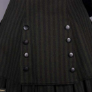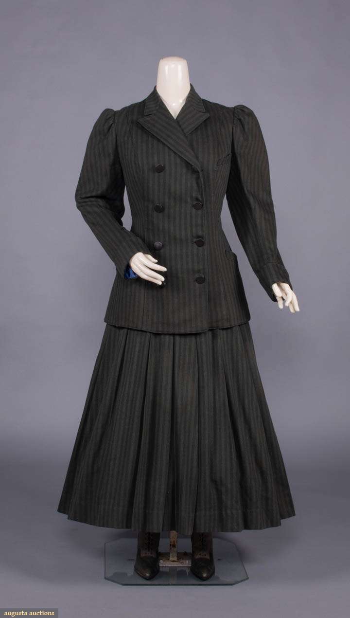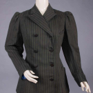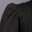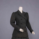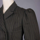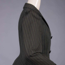 Wool twill w/ printed brown stripe on green ground, notched collar, faux double breasted extending bodice w/ slit B & H pockets, rows of decorative composite buttons to back vent, modest leg o’ mutton sleeve w/ stationary turn-back cuffs, gored skirt w/ controlled pleats let out into full skirt, bodice lined in blue silk taffeta, B 39", W 32.5", L 26", skirt W 29", L 35.5", (boots N/I, light underarm stains, two 0.25" holes right SH & 1 to seat, minor pilling, cluster of 0.75" repairs to lap) excellent. Ohio State Historic Costumes & Textiles Collection.