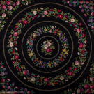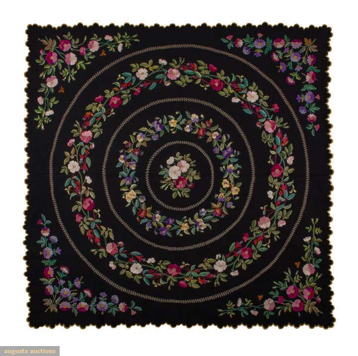 Black wool broadcloth table cover embroidered w/ ombre silk floss in graduated wreath of wild rose, fuchsia, pansy motifs separated with feather stitch rings, branching floral corner motifs 2 w/ bees, embroidered compound scallop edge, most likely American, 54” x 54.5", (very light wear at center fold line) excellent.