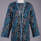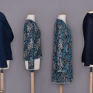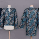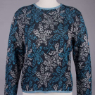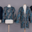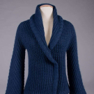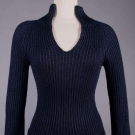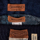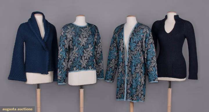 1 navy wool blend knit cardigan w/ shawl collar & bell sleeve, c. 1976, label "Missoni Made in Italy", open front 33", L 23", (minor wear/pilling); 2 pc lurex c/o of sweater & cardigan in shades of iridescent blue & silver on black ground, c. 1985, top w/ label "Missoni Made in Italy" & "Silk 40% Rayon 27% Cotton 18% Polyester 15%", cardigan open front 42", L 34", top B 38", L 22", (cardigan label removed, few small pulls to both); 1 dark navy cotton blend sweater w/ convertible collar, c. 1972, label "Missoni Maglia Knitwear Tricot, Made in Italy" & "Saks Fifth Avenue Potpourri", unstretched B 26", L 27", (tiny pulls, minor pilling) all very good. Museum at FIT.