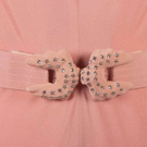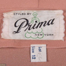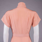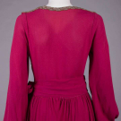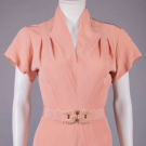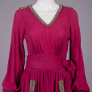 1 fuchsia rayon crepe hostess gown w/ shot silver & gold beadwork applied to V-neckline, epaulets, cuff & as front faux pocket, bishop sleeve, bodice gathered into W w/ draped over panel to tie at left H, full length skirt, B 36", W 27", L 56", (hem soiled, many sm light stains, tiny hole in lap, many tiny-0.75" seam openings in skirt, fading in skirt, few tiny pulls) very good; 1 synthetic peach fine crepe w/ V-neck, shawl collar into to let out box pleats over SH, self-cover belt w/ shaped rhinestone buckle, full ankle length skirt, label "Styled by Prima New York", B 38", W 24", L 55", (belt stiff w/ a few small wear spots on buckle) dress excellent, belt fair.