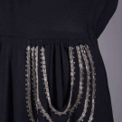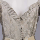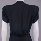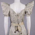 1 silver lamé iris motif on grey satin ground, sweetheart neckline w/ self-ruffle, dramatic standing puff sleeves, fitted bodice w/ flat self-covered CB buttons, full length skirt, silk velvet ribbon belt w/ faux filigree embellishment at CF & at tails, late 1930s, B 36", W 26", L 60", (minor shattering at SHs, 3 missing buttons, minor pulls at SHs, discoloration/wear stripes to belt) good; 1 black crepe w/ ruching at padded SHs, V-neck, bugle & flat oval beading in graduated rows at edge of inset left W pocket, early 1940s, B 36", W 26", L 58.5", (minor bead loss, few broken beads, belt loops/tacks cut short & belt missing, very light discoloration neckline) very good.