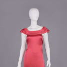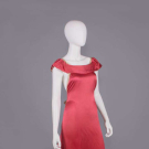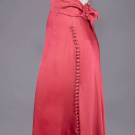 Cerise crepe back silk satin w/ slender SH straps, weighted floating bateau collar w/ standing shaping over SHs, plunging back w/ back half belt & self-covered buckle, row of bullseye self-covered buttons from back left H to hem, B 29", W 27", L 54", (several tiny holes lap, many tiny pulls, light general staining to satin, discoloration to cream accent fabric, staining back hem, buttons worn/fraying w/ 2 missing, 1" tear right armscye, 2 back SH straps detached) fair.