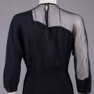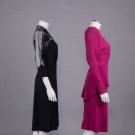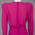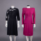 1 black crepe w/ asymmetrical souffle illusion neckline & sleeve embellished w/ corded appliqué, label "A Filmland Creation Miss Hollywood Jr. Copyrighted 1935", B 40", W 26", L 42", (fraying to edges of appliques, 0.75" seam fray between right yoke & armscye, belt tack at right W cut & belt missing) very good; 1 magenta novelty crepe w/ strong SH, bodice pleated into CF, shaped peplum H drape, zip, snap & hook & eye back closures, B 42", W 25", L 42.5", (few light spot stains, 0.25" wear spots right arm & left cuff, 0.5" seam opening left sleeve, few tiny pulls) very good.
