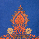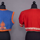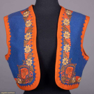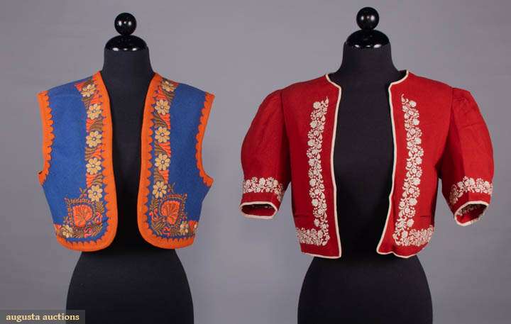 Both hand Matyo embroidered on wool: 1 red w/ silk grosgrain edging, 2 pockets, label "Made in Hungary Hand Work", open B 36", L 16.5", SH-SH 18.5", (tiny spot stains, few tiny-0.25" holes, label worn); 1 blue vest w/ pearl cotton embroidery & pinked orange wool border, B 38", L 15", (snacks, tiny spot stains, embroidery inking visible right SH, 1 detached trim scallop back right W) both good.