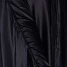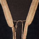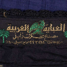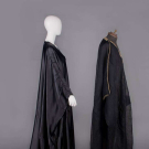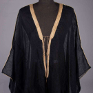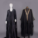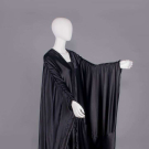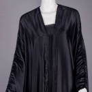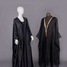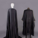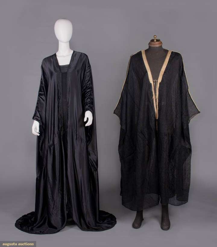 1 black silk satin woman abaya w/ crochet edge, label in Arabic, flat Wd 63", L 61", (scattered tiny pulls, 2" faded stamped label CF opening) excellent; 1 hand loomed black fine wool gauze man’s bisht w/ tablet woven lame’ trim, probably from Saudi Arabia, flat Wd 62", L 40", (few tiny-0.25" holes, few tiny pulls, minor tarnish to lame') very good.