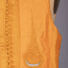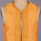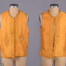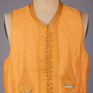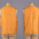 1 goldenrod vest w/ embroidered pockets, CH/W 39", L 22.5", (few tiny pulls, 0.25" repair left W SS, light staining to lining, few panels asymmetrical); 1 goldenrod vest w/ no pockets, CH/W 35", L 23.5", (few tiny pulls, front panels asymmetrical, 0.75" fraying tear left SS at underarm, 2 tiny spot stains right front W, 0.75" light stain right SH blade) both good.