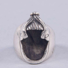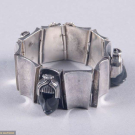 3-pc set sterling silver & (most likely) carved obsidian face motifs set into elaborate sterling headdresses from the Taxco silver workshop of Felipe Martinez: 1 brooch/ pendant, stamped "Sterling Taxco Piedra Y Plata", 1.5" x 3.75" x 1",(metal scratched/patina, dirty, few tiny dents); 1 ring, 1" x 1.25" x 1.25", band circ. 55 mm, size 7.5, (stone missing, scratched, tarnish, indents); 1 bracelet w/ simple box clasp, stamped “Piedra Y Plata Martinez Sterling Taxco 101", Wd 1.25", inner circ, 7", (tarnish, scratches, few tiny divots) all good- very good.