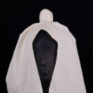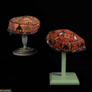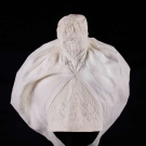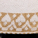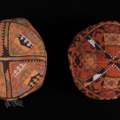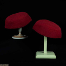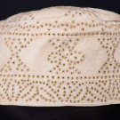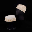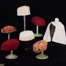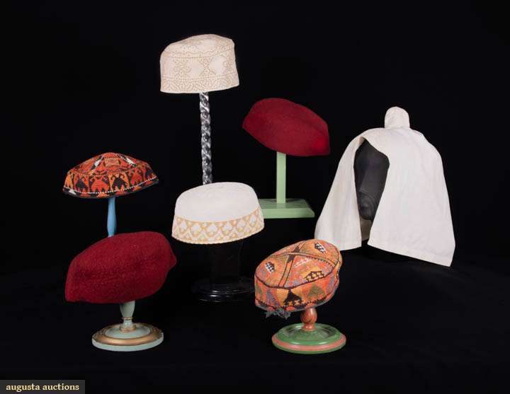 2 traditional mens hats, Afghanistan, mid 20th C: 1 orange, black, purple & white embroidered, circ. 22", size 7, (slightly crushed) & 1 orange, green & purple embroidered, Ht 3", circ. 21.25", size 6.75, (tassel fraying, bent); 1 quilted white Kuma w/ ecru eyelet embroidery, possibly Oman, circ. 22.25", size 7, (minor staining); 1 white crocheted w/ Zari, Mumbai Bohra people, Muslim, circ. 22.25", size 7, (few tiny spot stains); 2 chechia knitted red felt caps w/ orig packaging, label "Chechias Tunisiennes..Tunis", 1 w/ circ. 21", size 6 3/8, 1 w/ circ. 23.5", size 7.5, (creasing, few tiny snacks); 1 woman’s regional headdress w/ neck drape, Northern Afghan, 16.5"x2.5"-12", (most w/ wear/discoloration) all very good- excellent.