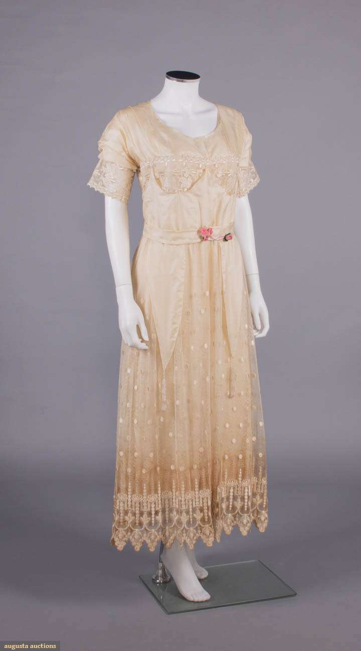 EMBROIDERED TULLE & SILK WEDDING DRESS, 1910s