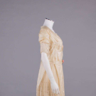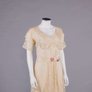 Wedding dress of Schiffli embroidered linen tulle over cream silk satin w/ twill silk yoke extending into sleeve caps & overlay to bodice, as W band & falling tabs over Hs terminating in crystal & coral beaded tassels, silk crepe de chine & satin flower panache at W, B 37", W 27", L 53", (tidemarks to tulle hem, many tiny light spot stains, light SH & underarm discoloration, few tiny tears to lining at neck, shattering edges of underskirt at CB opening) good.