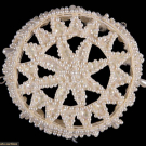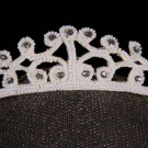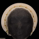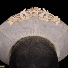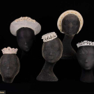 1 pink beaded & lace crown fascinator, circ. 11", Ht 0.75"-2.25", (tulle worn, bead/sequin loss, glue discolored, pulls); 1 wired net headdress w/ chemical lace embroidered w/ faux pearls, circ. 19", Ht 0.75"-4.5", (light discoloration, tiny-1" holes in net); 1 tiny white beaded pillbox hat, circ. 12.5", Ht 1.75", (remnants of tulle, minor bead loss, slightly crushed); 1 cream satin corona headdress w/ ruched & wired bands, small row of miniature wax flowers & bud on green silk covered stalk, Ht 8.5", Wd 9.5", (holes up to 6" in net crown, minor warping to florals); 1 beaded bridal crown w/ white seed beads & rhinestones, circ. 18", Ht 0.5"-1.75", (tulle very worn, many cracks in backing, minor damage/loss to stones) all good- fair. North Coast College.