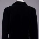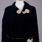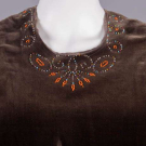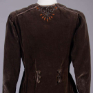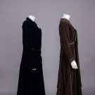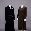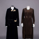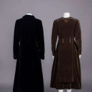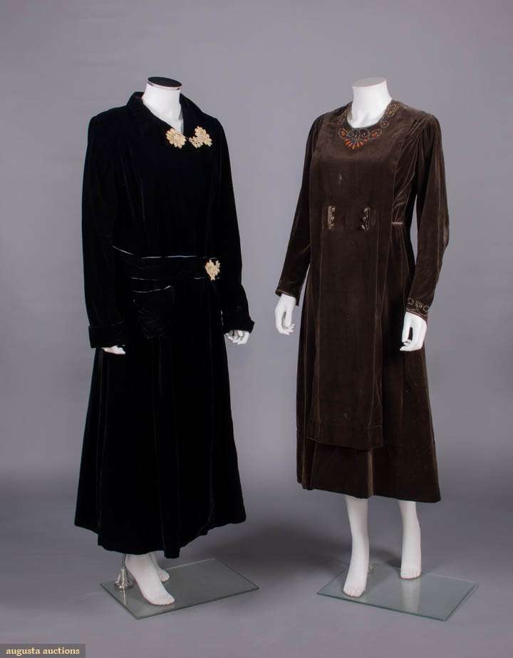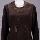 1 black silk velvet house-robe w/ notched collar, cross-over front w/ integrated belt W band & snap closures at left H, blue patterned silk lining & facings to belt, cuffs, front opening & patch pocket at front right H, chemical lace appliqués to collar & closure, internal W tie, B 46", W 41", L 52", (minor crushing, lace discolored) excellen; 1 brown silk velveteen day dress w/ round neckline & cuffs embroidered w/ variegated seed beads, floating front & back straight panels over partial gimp bodice w/ paired rows of grooved & painted composition buttons at front Hs along opening for inserted belt or sash, c. 1912, B 42", W 38", L 47.5", (satin binding shattered, 0.75" stain B, tiny spot stains, buttons moved CB W, SH closures altered) good.