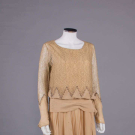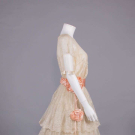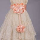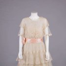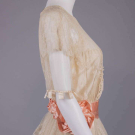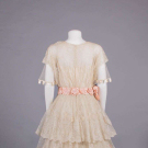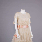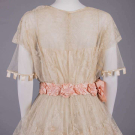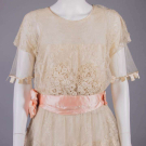 Cream Chantilly lace w/ Irish crochet appliqué above CF W, fine silk tulle sleeves trimmed w/ silk satin ribbon crenelations, pink silk satin cummerbund W band w/ embroidered floral rosettes, satin under-bodice, B 32", W 28", L 47", (slip N/I, 2.25" hole front right SH, light tiny-small spot stains, 0.75" hole right W, sash shattering) good; t/w silk crepe de chine w/ woven lame lace & iridescent beads. North Coast College.