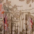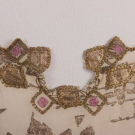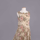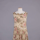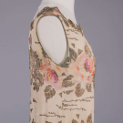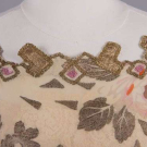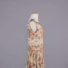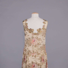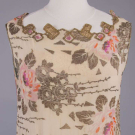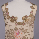 Gold lamé brocade printed in rose motifs on cream silk crepe de chine ground, lamé cord applied to crenelated W w/ inset ruching, gold appliqués & chainstitch embroidered forms to neckline & to hem over gold mesh, piped armscye, B 36", W 33", L 43", (tarnish w/ some oxidization, underarm stains, 1.25" green stain CF W from oxidization, minor fraying, 0.5" repair right front, 0.25" hole CB W, 0.5" hole right H & 0.75" hole CB at dart) very good.