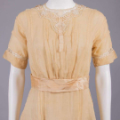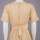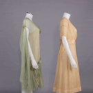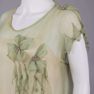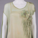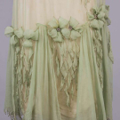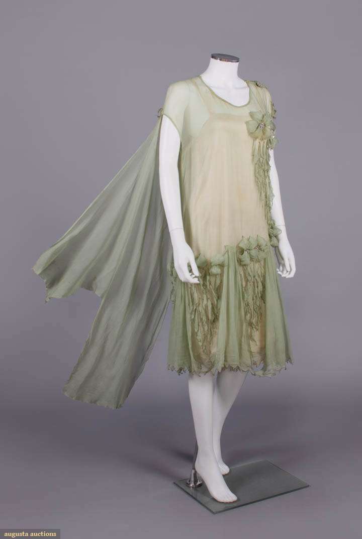1 sage silk crepe w/ manipulated 3-dimensional cinquefoil & trefoil panache rosettes w/ rhinestone centers & cascading diamond drops, asymmetrical SH drape across back from left SH to right armscye, skirt w/ ruched falls tacked to one another at Van Dyke hemline, all edged w/ silver wrapped thread, B 44", W 42", L 41", (broad staining, fraying at panel edges, tiny-0.25" wear holes, undone tacks, few damaged rhinestones) good; 1 ecru silk organdy w/ Maltese bobbin lace insertions & applique at neckline,pleated attached pale pink cummerbund sash, label "Best & Co. Paris, New York", B 36", W 29", L 43", (tiny-sm spot stains, shattering to sash & ribbons, few missing closures, lg pull left SH blade, light stains to seat) good. North Coast College.