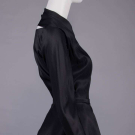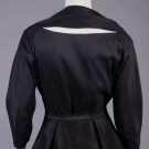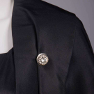 2-pc black finely ribbed silk lined c/o fitted blouse w/ extended panel from right B into draped half stole into left front SH fall held w/ round pronged rosecut & baguette paste buttons, waltz length wrap skirt w/ shaped high-low hemline & same button closures to left front H, lined in black nylon tulle, label "Hattie Carnegie", B 37", W 28", L 21", skirt W 26", L 29"-39.5", (very light 0.25" stains back W, stone loss to 2 buttons on skirt) excellent.