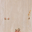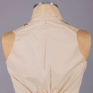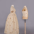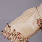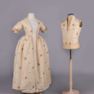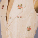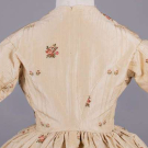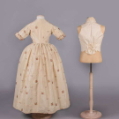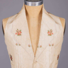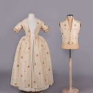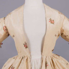 Open robe of 1770s silk w/ sparse floral springs weft brocade on cream vertical patterned striped ground, triple box pleated cuff edging w/ fly fringe & elaborate woven edging, re-made in the 1840s w/ matching symmetrically pieced waistcoat hand sewn from original petticoat w/ notched lapel, functional front pockets, single side breast pocket & corded edging, robe B 32", W 22.5", L 48",34", L 17", (many tiny-0.5" holes, shatter spots & stains, broad light staining, underarms & hem stained/worn, 0.75" tear CB neckline) good- fair. Waistcoat CH 37", W 34", (stained/discolored, 1.75" stain CF, many tiny-0.25" spot stains, shattering to neckline) good.