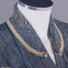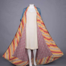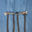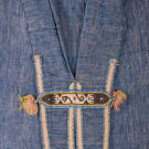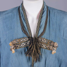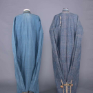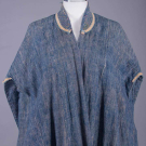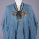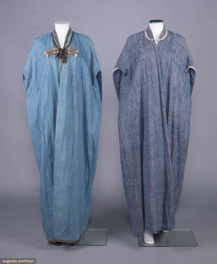 1 indigo dyed Egyptian cotton w/ tablet woven edging, vestigial sleeves & CF w/ tablet woven cord, metallic tassels & rosettes, CF w/ beaded tassels, red & yellow printed cotton lining, SH-SH 19", W 67", L 59.5"-62", (light stains, 1", 0.75" & 1.5" tear at CB SHs, W line altered to make shorter, lame tarnished/worn, trim worn/fraying, tassels messy) good; 1 indigo dyed silk & cotton w/ embroidered collar, band woven edging & tablet woven band across vestigial sleeves at back w/ short tassels, SH-SH 18", W 61.5", L 55"-59", (lining missing except at collar, embroidery worn, tassels messy, light stains, trim strip detached right back) very good.