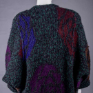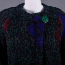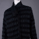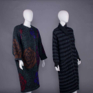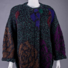 1 wool, alpaca & mohair blend double face knit w/ oversized rose motif, asymmetrical wrap front w/ large single forest green button closure, raglan sleeves w/ deep pocket inserted into seam, c. 1984, label "Missoni Made in Italy", B 54", L 47", (pilling, few pulls) very good; 1 wool black & grey checkerboard boucle, black asymmetrical ribbed knit wrap collar w/ tie closure & matching cuffs w/ thumb hole, deep H pockets, c. 1978, label "Missoni Made in Italy", B 46", L 47", (pulls, internal belt missing, tear in sleeve lining) excellent. Museum at FIT.