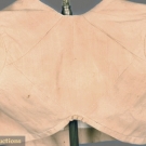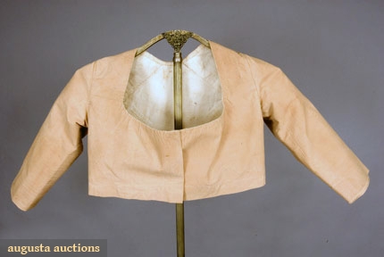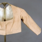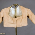 Short jacket or bodice of tan Nankeen cotton, center front opening without closures, low scoop neckline, three quarter straight sleeves, high waist with center back narrow ruffle, white linen lining, (few minor stains) excellent.