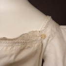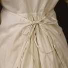 Tabby cotton, trimmed with drawnwork and darned net lace, apron front construction, square neckline edged with bobbin lace, buttoning on both sides at front armscye, short puff sleeves, slim skirt with extra fabric gathered at back, hem scalloped and trimmed with drawnwork, (inner cotton bodice bands torn, two small tears near hem) excellent.