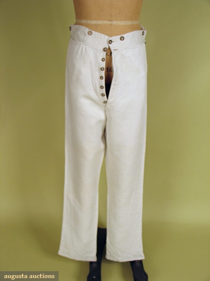 Linen twill, twenty four metal buttons stamped "Warranted Not To Cut", including buttons sewn inside pants hem, long slim legs, all hand stitched, red cross stitched "I.G." in waist lining, (frayed cuffs) excellent.