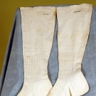 Pair white cotton hand knitted with fancy textured zig-zag pattern on instep and front of ankle, ribbed tops (light stains, mends) excellent.