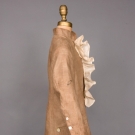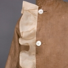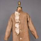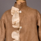 Machine stitched A-line shape, five button front with added white ruffle, 1.5" stand collar, two patch pockets with two buttons, sleeves with two small buttons, (white ruffle probably added later for costume, stains) excellent.