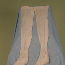 White thin cotton stockings knit with geometric patterns from foot to top hem, (some stains, holes, mends) good.