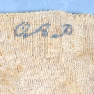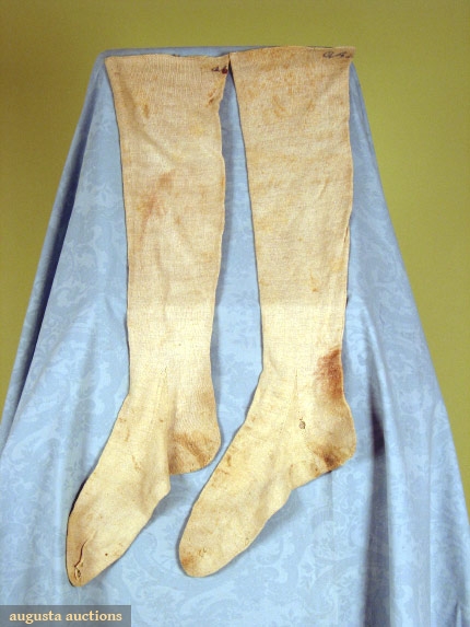 Pair hand knit linen stockings, monogrammed in blue script at top "OAP", (holes, spots, monogram possibly later addition) fair.