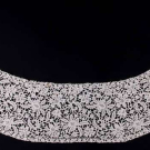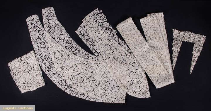 1 lace length of Italian needlelace yardage, L 9.5 yds, Wd 4.5", (light stains); 1 small square collar of Italian needle lace, inner circ. 22", outer 33", Wd 3", (broken brides); 1 chemical lace cuff, circ. 19"-21", Wd 6"-8", (broken brides, worn/stained thread knots at edge); 1 chemical lace large collar, inner circ. 40", outer 60", Wd 11", (inner edge raw, broken brides); 1 large circular flounce of chemical lace, inner circ. 62", outer 83", Wd 11", (broken brides, spot stains); t/w 4 lace pieces, all good-excellent.