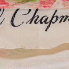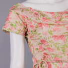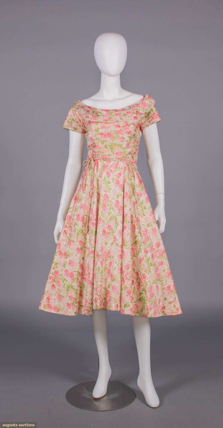 Floral print on white silk shantung ground w/ draped scoop neck, short draped cap sleeves, fitted bodice w/ double spaghetti cord at W, skirt box pleated into W, silk lined, B 34", W 25", L 44", (bodice boning w/ minor warping, 1" shatter CF skirt, 0.5" pull below front W, 0.25" stain front right SH, underarm wear, loose stitches back right collar) excellent.