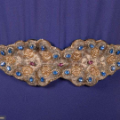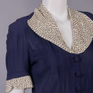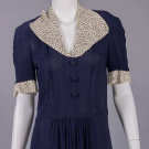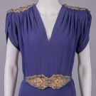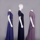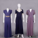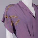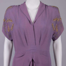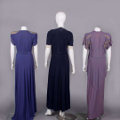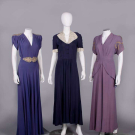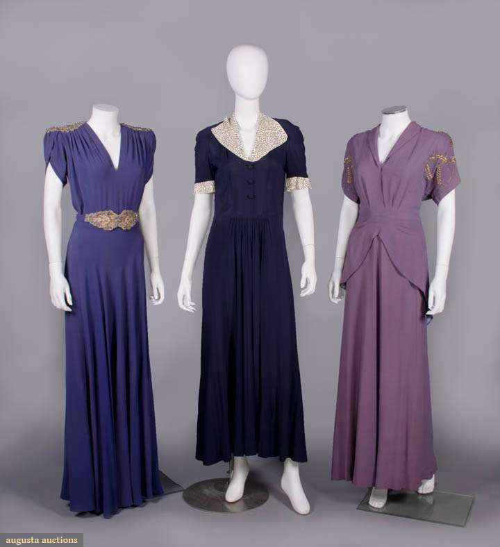 1 purple w/ SH & belt appliques w/ short chatoyant bugles, pronged colored rhinestones, faux pearls & fine gelatin sequins, B 40", W 28", L 62", (belt dirty, minor bead loss, fading/discoloration, many tiny pulls, few pinholes at W) very good; 1 navy blue w/ cream puckered crepe collar & short sleeve cuffs studded w/ pronged rhinestones, B 35", W 28", L 55", (rhinestone loss/damage, few tiny holes, light fading to skirt, 2.25" light stain b/t SH blades) excellent; 1 mauve hammered crepe w/ metallic chain stitch embroidery & wheat kernel nailheads, peplum to point at CB, B 44", W 30", L 59", (stains/fading throughout, minor pulls, belt missing) good.