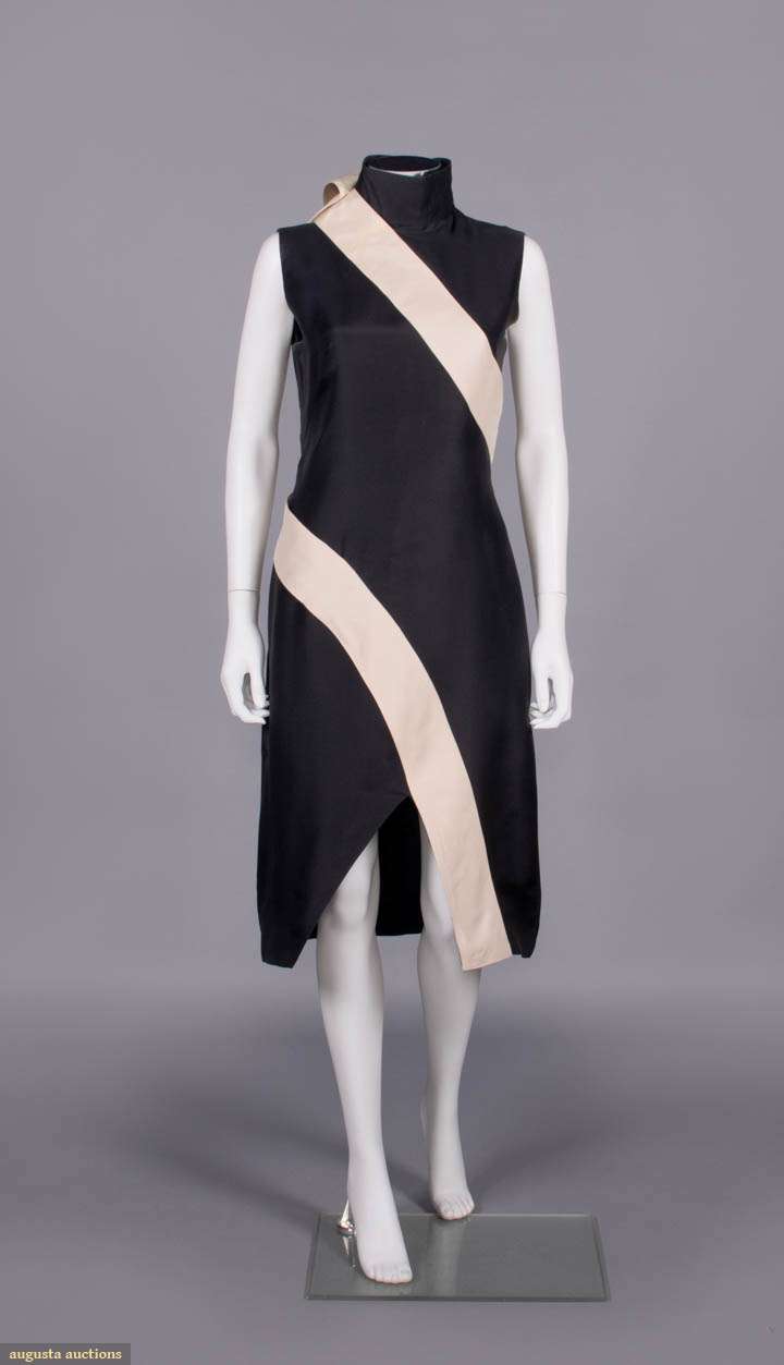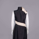 Sleeveless black silk twill w/ cream diagonal floating band from right back SH in large open loop extending over B, around back & down front into notched hem, high standing tube collar, lined in black china silk, label “Alexander McQueen, Made in Italy”, B 36”, W 28”, L 42”, (heavy underarm discoloration, some creasing/light discoloration in white band) good.