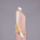 Pale pink silk boudoir robe w/ lace tiered sleeves, shawl collar & right pocket. This item came from a random box in the warehouse. It was photographed to illustrate the types of items to be found in the DISCOVERY boxes. Live bidding only.
