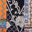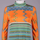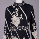 1 long sleeve ethnically inspired printed silk tricot in blues, green & yellow bands & zigzags on orange ground, standing collar, CB zip closure, label “J. Tiktiner, Made in France”, B 36”, W 34”, L 40”, (few tiny stains) excellent; 1 Chinese inspired white chrysanthemum & fish scale print w/ lightning accents on black ground, standing collar, CB zip closure, label “Paganne by Gene Berk”, B 40”, W 32”, L 40”, (few tiny stains lap & CF, few loose stitches right cuff) very good; 1 printed silk in rows of Chinese inspired mosaic florals in blues, creams & browns, full sleeves into fitted cuff, tie band at W, label “Paganne by Gene Berk”, B 38”, W 36”, L 43”, (pilling in left cuff, CF zip & inner hem) excellent.