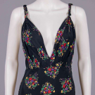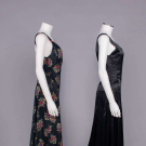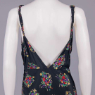 1 resist printed black silk w/ floral bouquet motif in red, purple, yellow & green, deep V CF into plunging back w/ self wrapped straps, early 1930s, B 36”, W 26”, L 56”, (few stains in skirt up to 1”, 2” & 1.5” seam openings lower right skirt SS, 0.5” repair right B SS, minor underarm discoloration) very good; 1 black silk satin w/ rows of faux Italian hemstitching into gathers at CF W, back & sides, skirt w/ asymmetrical gathered set-in panels, slightly gathered deep hem flounce, B 35”, W 28”, L 56”, (scuffs/wear, holes up to 0.5”, messy repair left SS, seam strain right SS, some fraying at hem flounce, seam openings at hem up to 16”) good.