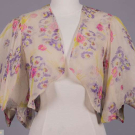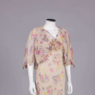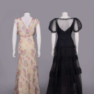 2-pc bias cut floral printed silk crepe chiffon in lavenders, pinks & yellow on cream ground w/ gathers from diagonal front seam over SHs & into crossover back w/ hook & eye closure, CF blossom corsage of self fabric w/ rolled hem edging, self covered belt, slightly flared skirt, open front bolero jckt w/ pagoda slvs stitched to create 4-pointed falls around elbow, c. 1935, dress B 36”, W 28”, L 60”, jacket SH-SH 14”, L 18”, (tide mark left H, few stains up to 1.5”, two 1" tears left jckt slv) very good; 1 black silk organza w/ lace insertion to neckline, short puff slv cuffs & midriff w/ 3 graduated attached lace trims from H to knee, fine gathers over B, left zip closure, c. 1937, B 32”, W 22”, L 60”, (seam openings, holes up to 1") good. Uconn.