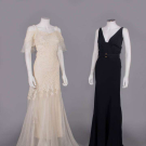 1 cream party dress w/ embroidered floral openwork silk blend lace stitched into flared white silk chiffon floor length skirt & w/ chiffon edged off-the-SH drape, side zip closure, c. 1932, B 32”, W 26”, L 60”, (slip N/I, stains up to 3.5” skirt, repairs up to 5” in skirt & holes up to 0.75”, 0.5” hole in lace CB collar); 1 black hammered rayon crepe w/ truncated V neck w/ gathers over B & 3 spaghetti straps from edge of deep V back into SHs, fine ruched gathers across CB panel of skirt, self belt pulled through gold circlet & w/ snap closure at CF, short back train, mid 1930s, B 40”, W 28”, L 64”, (light underarm discoloration, few tiny-0.75” wear spots, few seam openings up to 2” at SS & W, 1” repair right hem) both very good. Uconn.