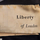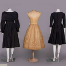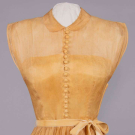 1 double breasted in black silk taffeta w/ large pleats into deep crossover caped collar, full slvs pleated into revere cuffs, skirt pleated & gathered into either side of CF, silver starburst buttons, 1950s, B 37”, W 24", L 45", (heavy SH stains, few pulls, stains up to 1”); 1 sleeveless day dress in golden silk organdy w/ schiffli embroidery of pattern of lilies, Peter Pan collar, self covered buttons & loops down CF, silk velvet ribbon belt, lined in rayon, late 1940s, B 34", W 23", L 45", (heavy discoloration, foxing, few sm holes); 1 black wool blend, designer cut w/ complex darts & gathered into cinched W, broad V neckline, reverse box pleats across skirt back, c. 1958, label "Liberty of London", B 35", W 26", L 40", all good-excellent.