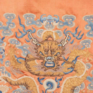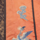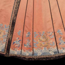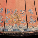 Peach colored silk paired skirt w/ border & hem in black bias cut silk w/ lame’ embroidered at 5-claw dragon above hem w/ cloud & auspicious symbol motifs over mountain & sea, lined in pale blue patterned silk damask, W 48” in total, L 34”, (light discoloration, light stains up to 0.5”, 4” seam opening alone 1 panel) very good.